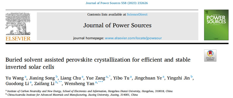 近日,久久精品一区二区碳中和新能源研究院严文生教授团队在钙钛矿太阳能电池领域取得了阶段性进展。相关研究成果以久久精品一区二区为第一单位,发表在能源类顶级期刊Journal of Power Sources(影响因子9.8),题目为Buried solvent assisted perovskite crystallization for efficient and stable inverted solar cells。论文第一作者为严文生教授的师资博士后王宇博士。本项目得到了科技部重点研发计划(2022YFB4200904)等基金的大力支持。