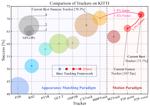 探索:该论文围绕激光雷达点云单目标跟踪任务,首先对现有主流跟踪框架进行了系统性的探索性实验,旨在厘清不同跟踪范式与结构之间的关系与优劣,如图1所示。通过对比分析传统外观匹配方法、运动建模方法及其组合模型的性能表现,作者发现:与复杂的外观匹配和运动建模相比,简洁而高效的运动结构在激光雷达点云中同样能够实现高精度、高鲁棒性的目标跟踪。这一实验结论为后续研究提供了明确方向,也凸显了在稀疏、不规则的点云环境中,运动信息在目标定位任务中的核心价值。
