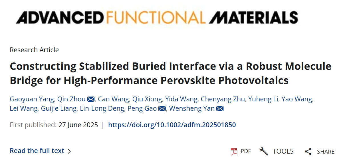 近日,我校电子信息学院能源电子团队(严文生教授)的研究生杨高元同学以第一作者在国际顶刊Advanced Functional Materials连续发表两篇高水平研究论文。第一篇论文发表于6月24日,题目为“Fluorinated Epoxy for Tailoring PbI2 Residue in Perovskite Films to Realize Stable Perovskite Solar Cells with Fill Factor over 87%”。第二篇论文发表于6月27日,题目为“Constructing Stabilized Buried Interface via a Robust Molecule Bridge for High-Performance Perovskite Photovoltaics”。在这两篇研究论文中,久久精品一区二区电子信息学院&杭电碳中和新能源研究院为第一单位。其中,周勤特聘副教授、严文生教授和中国科学院福建物质结构所高鹏研究员为论文通讯作者。